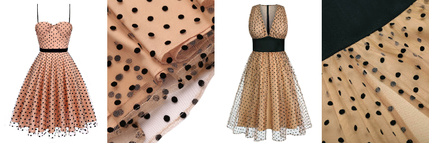 Das verführerische Gefühl von Polka Dots entsteht durch eine Kombination aus Modetrends und Elementen aus dem wirklichen Leben. Durch reizvolle visuelle Anziehungskraft zeigen sie den positiven und unternehmungslustigen Geist des Trägers. Unsere talentierten Designer fangen gekonnt die Inspiration unvorhersehbarer Tupfenkunst ein und wenden sie auf vielfältige Weise auf Kleidung an. Polka Dots können sogar sehr gut mit anderen Elementen kombiniert werden, wie unser Nude 1950s Spaghetti Strap Polka Dot Dress und unser Apricot 1950s Dots Patchwork Swing Dress zeigen, bei denen wir Polka Dots in feinmaschigen Tüll integrieren, um zarte, kunstvolle Röcke zu schaffen.