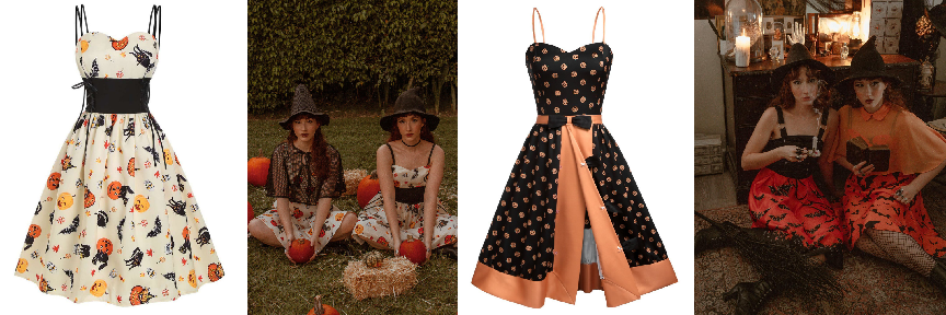 Dies ist ein Must-Have-Element für Halloween! Unsere Designer übertragen dieses lebendige Element auf Kleidung durch klassische gruselige Designs, gemischt mit Vintage-Kunst, und kreieren so einen einzigartigen Stil für diejenigen, die etwas Abenteuerliches ausprobieren möchten. Egal, ob Sie sie lieber als lustiges oder lebhaftes Motiv sehen, Sie können die Kürbismöglichkeiten auf unserem beigefarbenen 1950er-Kostümkleid mit Schnürung und unserem schwarzen 1950er-Kürbis-Strampler und -Rock sehen. Sie können sich sogar einen Vorsprung verschaffen, wenn Sie sich auf die nächste Themenparty oder Halloween-Party vorbereiten, zu der Sie dieses Jahr gehen.