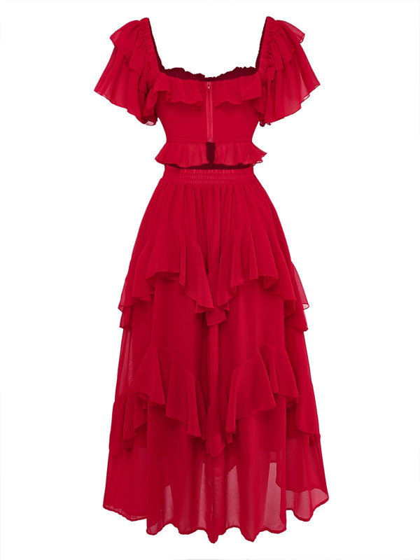 1950er Rüschen Gestuft Schulterfrei Maxi Kleid