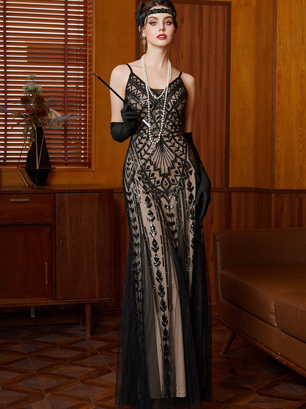 Schwarz 1920er Gatsby Pailletten Netz Maxi Abend Kleid