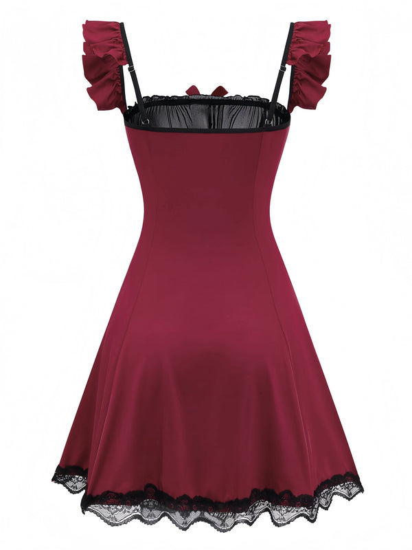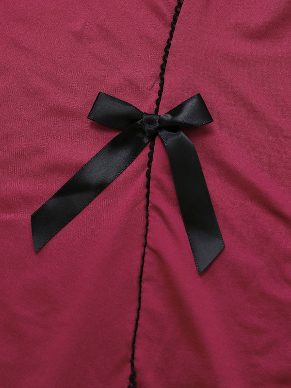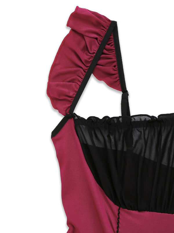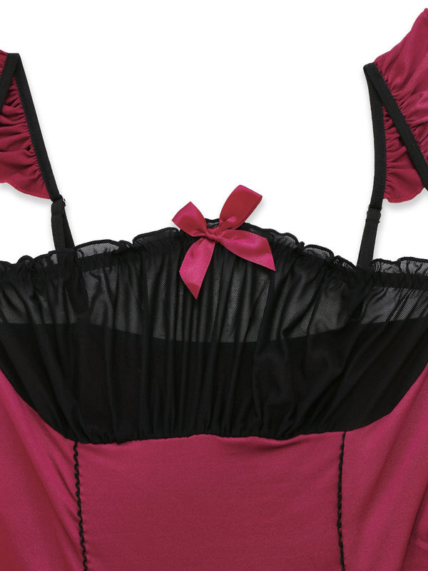 Rot 1960er Bogen Spitze Patchwork Rüschen Nachthemd