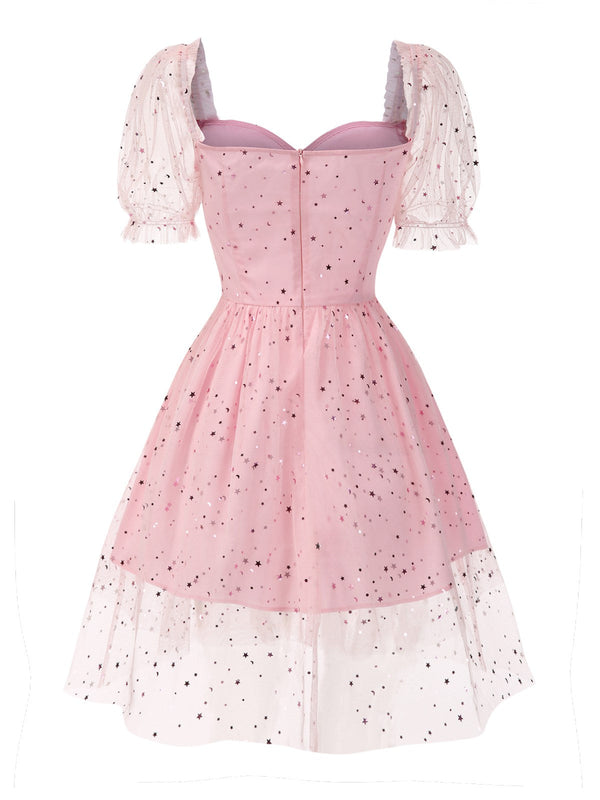 [Vorverkauf] Rosa 1950er Stern Pailletten Netz Patchwork Kleid