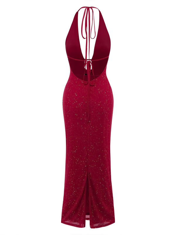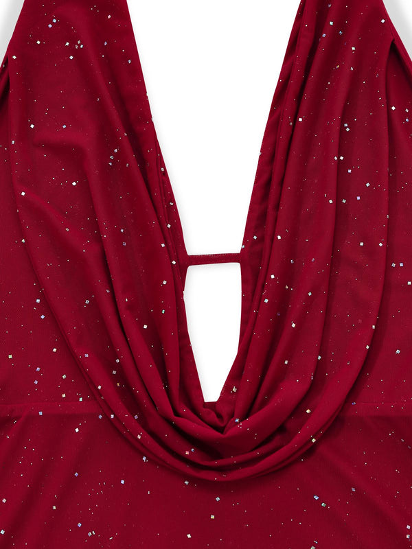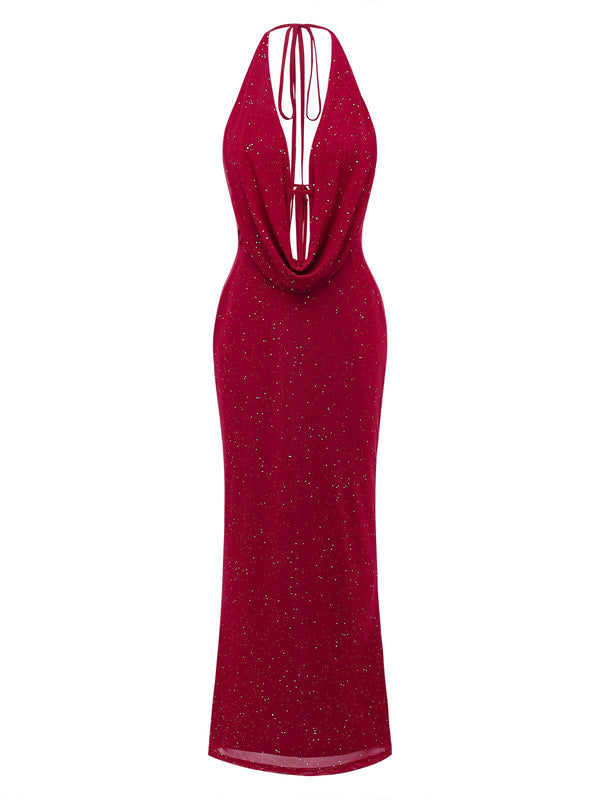 1980er Rückenfreies Glitzer Wasserfallkragen Halter Schlitz Maxi Kleid