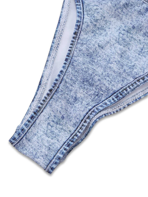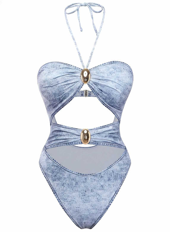 Blau Y2K Denim Muster Halter Cut-Out Einteiliger Badeanzug