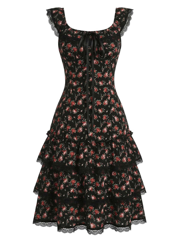 [Vorverkauf] Schwarz 1940er Blumen Spitze U-Ausschnitt Gestuft Kleid