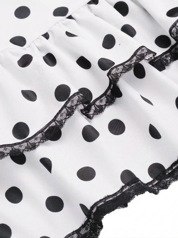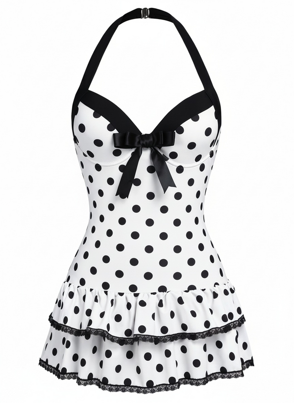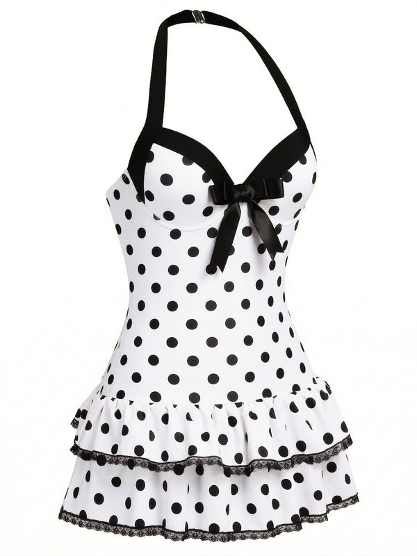 [Vorverkauf] Weiß 1940er Halter Polka Dots Schleife Einteiliger Badeanzug
