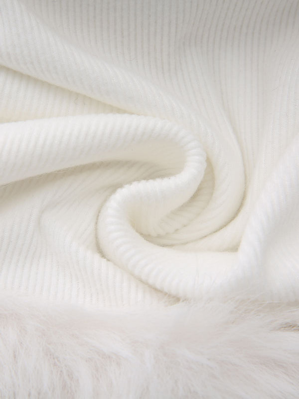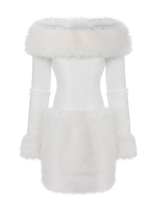 Weiß 1960er Weihnachten Faux Pelzbesatz Schulterfrei Kleid