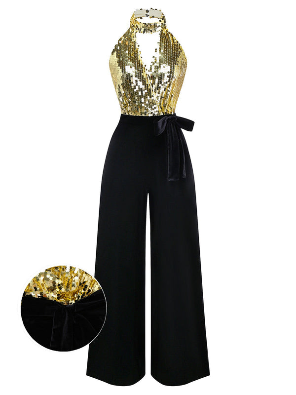 [Vorverkauf] Gold 1930er Pailletten Samt Schlüsselloch Halter Jumpsuit