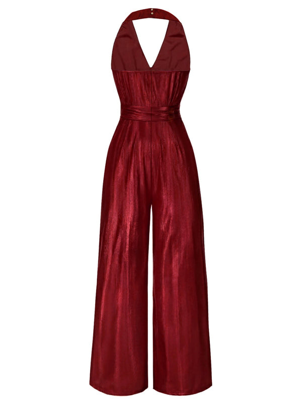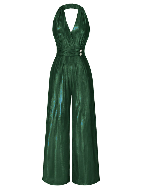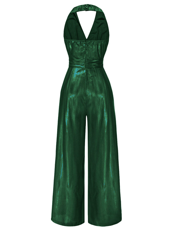 [Vorverkauf] Grün 1970er Solide V-Ausschnitt Halter Jumpsuit