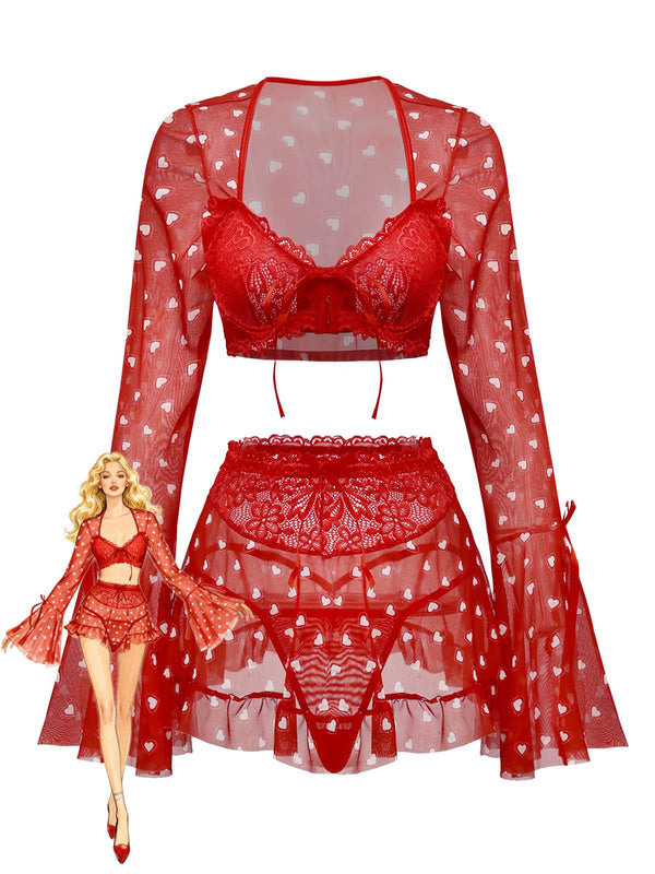 2PCS Rot 1960er Herz Bogen Rüschen Valentinstag Pyjama