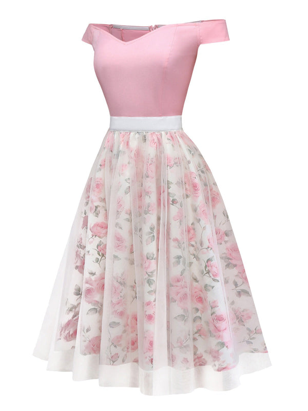 [Vorverkauf] Rosa 1950er Herzausschnitt Rose Netz Schulterfrei Kleid