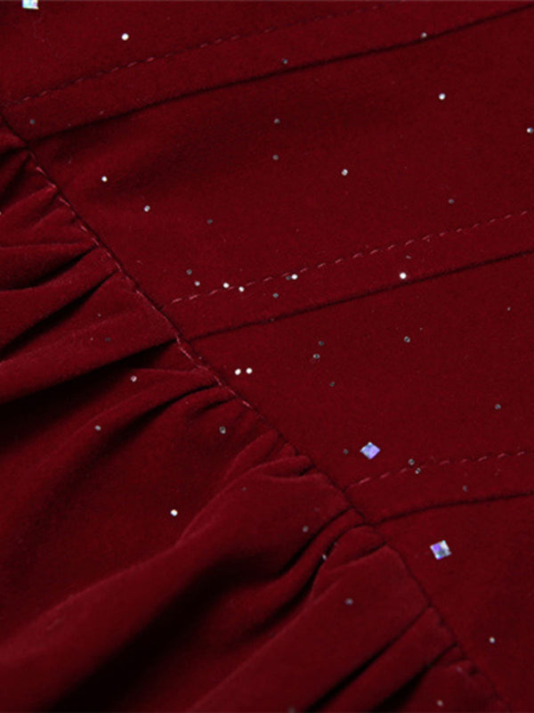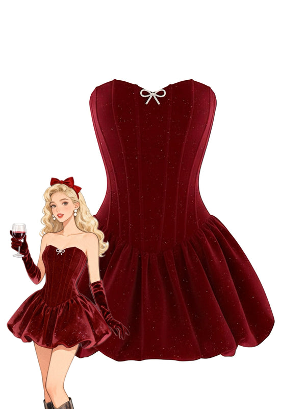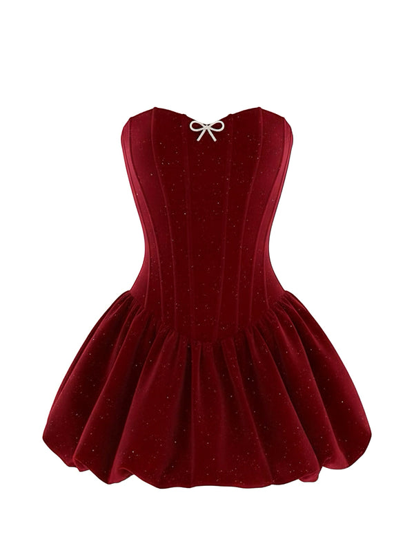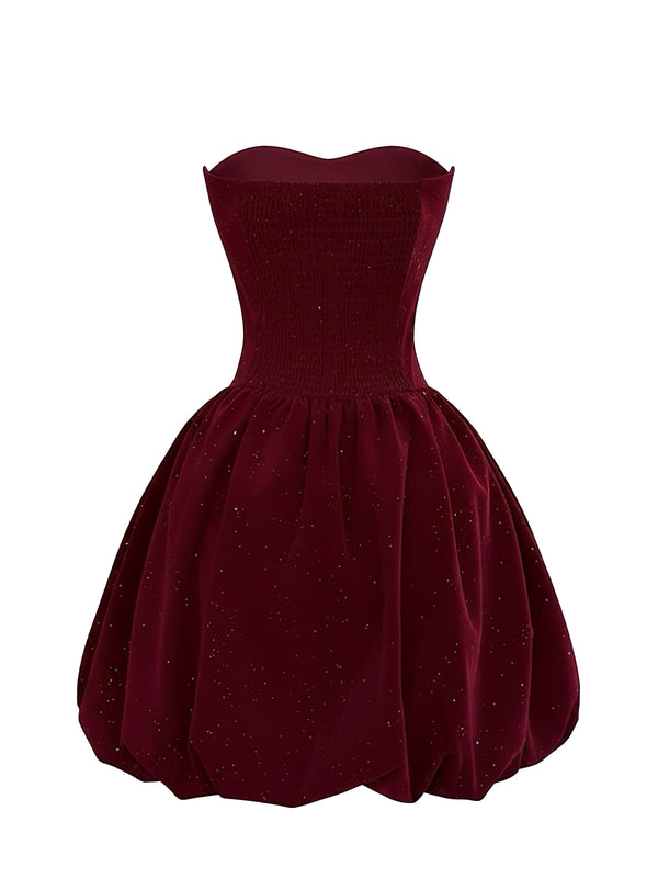 Weinrot 1980er Trägerlos Pailletten Bogen Mini Kleid