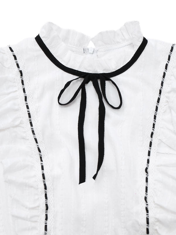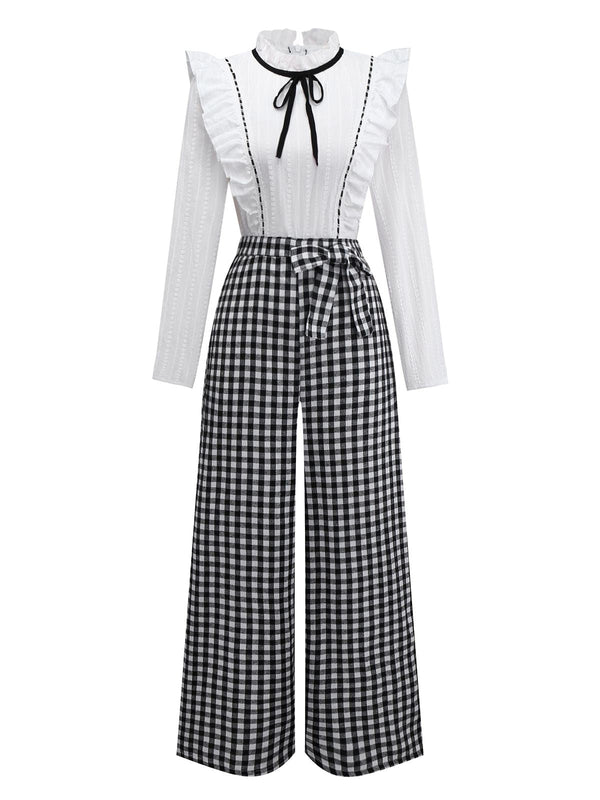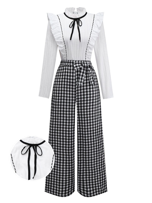[Vorverkauf] 1930er Baumwolle Rüschen Kragen Bogen Tie Gingham Jumpsuit