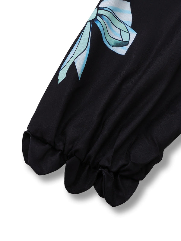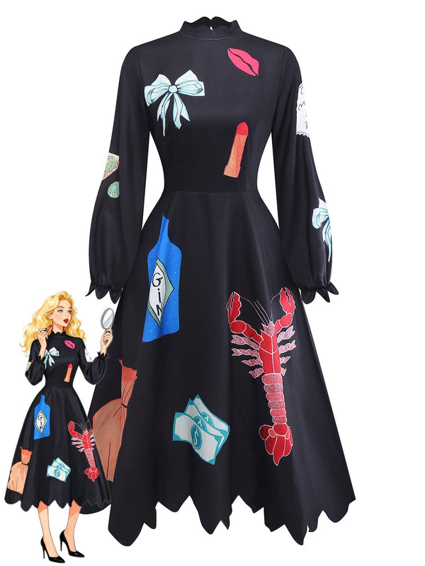 Schwarz 1950er Hummer Zickzack Hals Laternenärmel Kleid