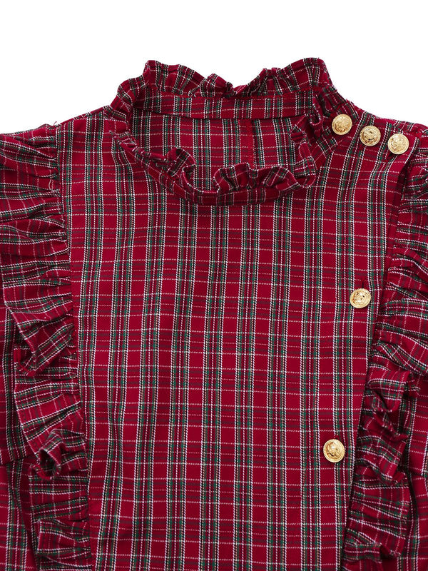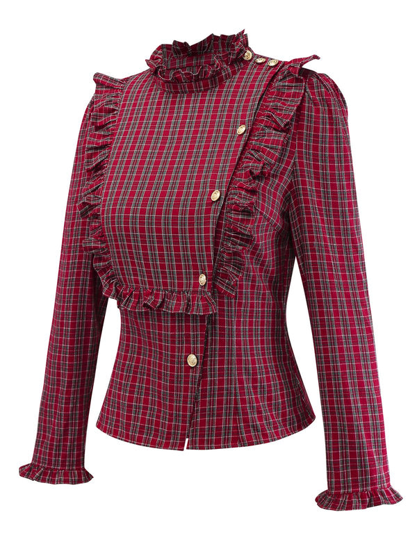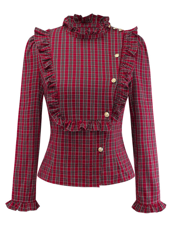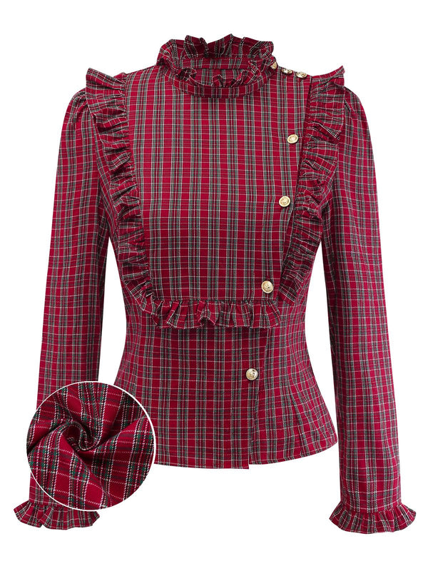 [Vorverkauf] Rot 1970er Rüschen Kragen Plaid Taste Bluse