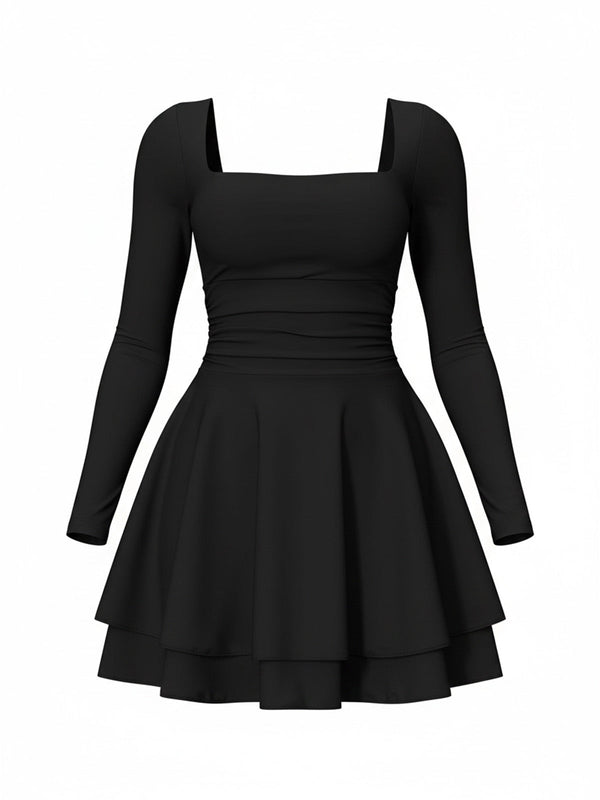 1980er Solide Tailliert Quadratischer Hals Langarm Kleid