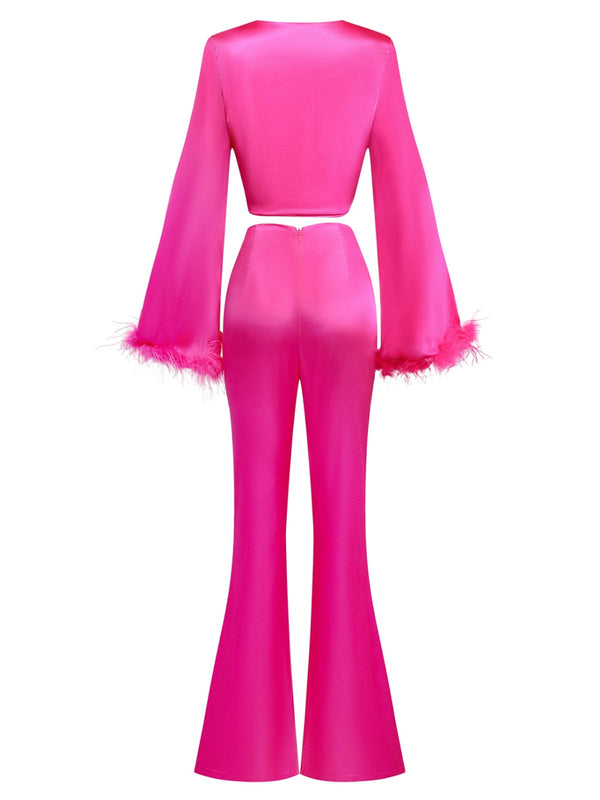 2PCS 1970er Feder Cuff Tie-Up Crop Top & Schlitz Hose