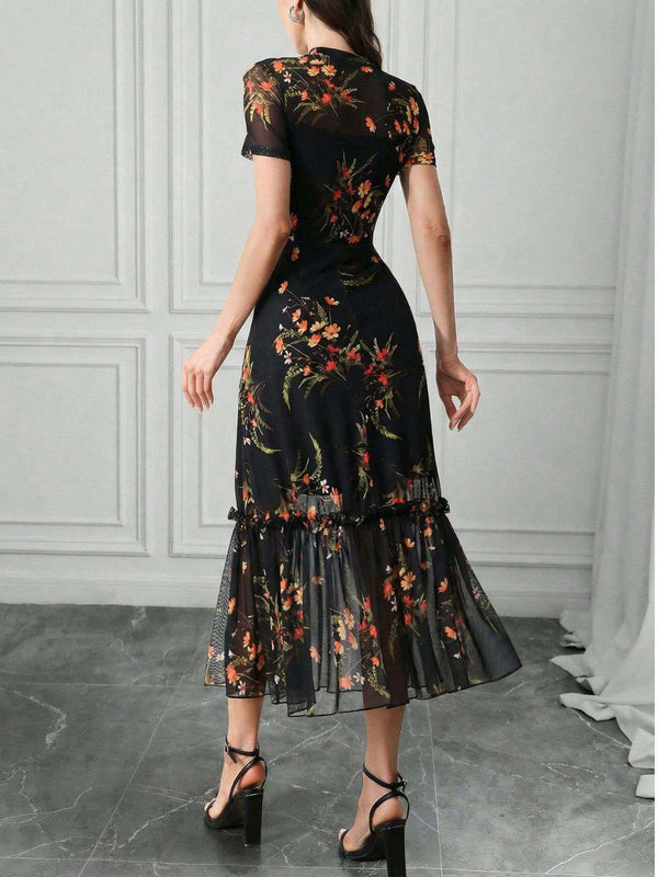 Dieses Retro-Kleid im Stil der 1930er Jahre strahlt eine ruhige, silberne Eleganz aus und ist perfekt für Vintage-Liebhaberinnen, die dunkle Blumenmuster und schwungvolle Silhouetten lieben. Weicher schwarzer Chiffon umspielt das Oberteil mit seinem hohen, zurückhaltenden Ausschnitt und den schmalen, langen Ärmeln, die an den Handgelenken in romantische Rüschen auslaufen, bevor sie an der Taille enger werden und Ihre Kurven betonen. Von dort fällt der Rock in kaskadenförmigen Lagen, die bei jedem Schritt schwingen und wogen, übersät mit warmen Herbstblumen, die an einen alten Garten in der Abenddämmerung erinnern. Kombinieren Sie dieses Kleid im Stil der 1930er Jahre mit T-Riemchen-High-Heels, Fingerwellen und einem tiefen Beerenrot auf den Lippen für Galerieeröffnungen, Abendessen oder Theaterabende, und Sie werden aussehen, als wären Sie direkt aus einem traumhaften historischen Drama entsprungen.
