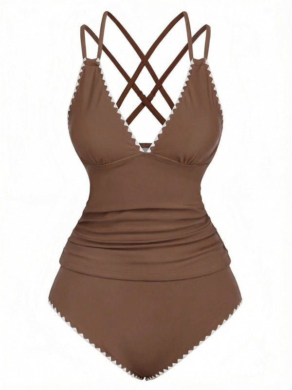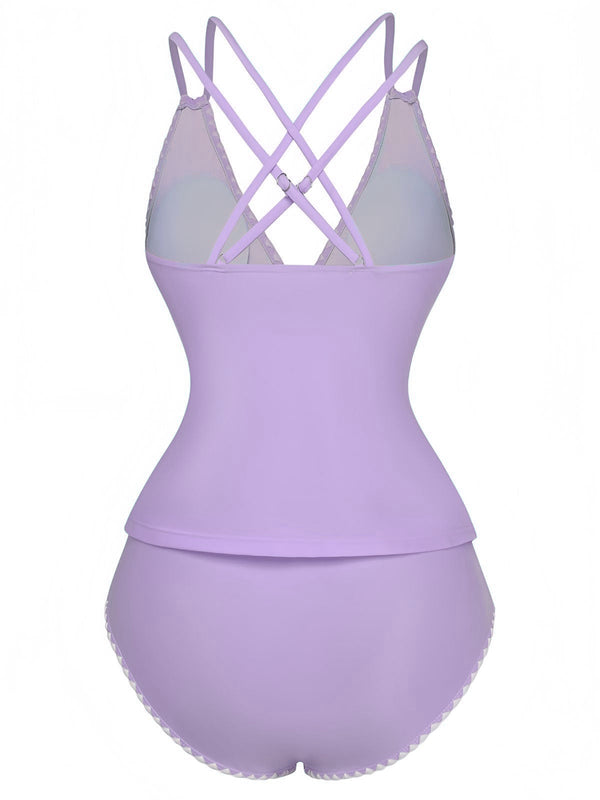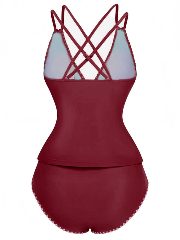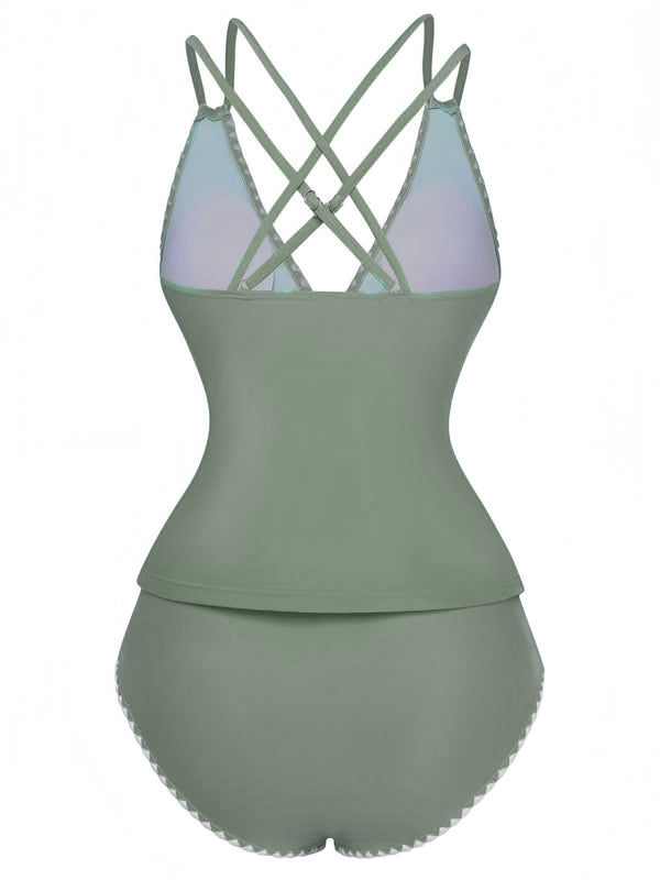 1940er Farbblock Tiefer V-Ausschnitt Rücken-Kreuzung Tankini Set